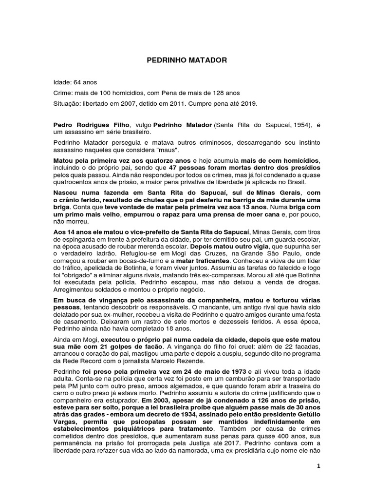 Pedro rodrigues filho (born 17 july 1954), also known as pedrinho matador (killer petey), is a brazilian serial killer who pursued and killed other criminals. Вчера, 3:14:57 pedrinho matador guerreiros da paz. Pedrinho matador pedro rodrigues filho, vulgo pedrinho matador, (santa rita do sapucaí, 1954) é um serial killer homicida psicopata brasileiro. His victims included 47 people who were. A biografia de pedrinho matador compre aqui abre.ai/ebookpedrinhomatador.